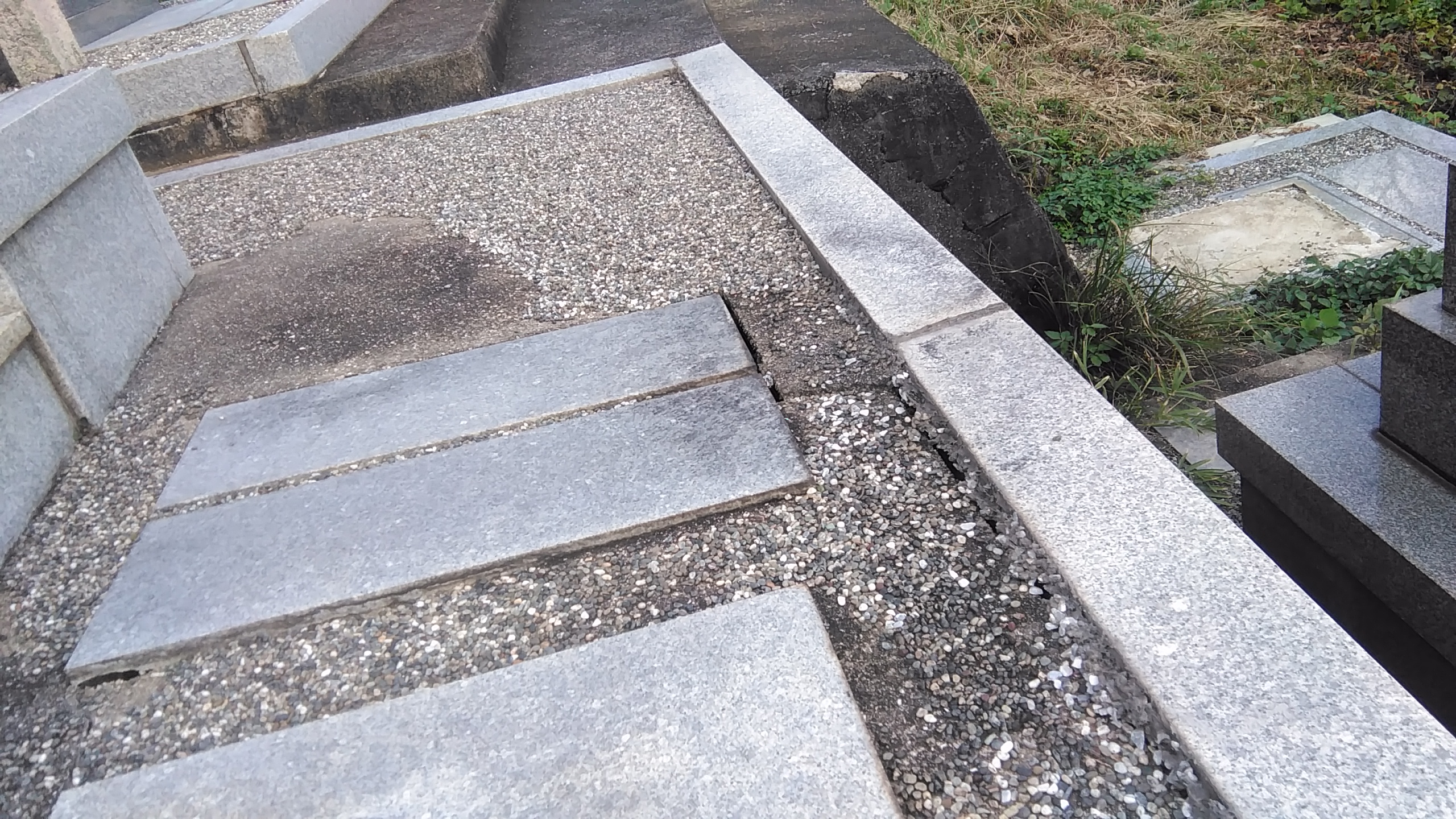縁石がずれていて土間コンクリートも割れていて拝石も傾いていました。